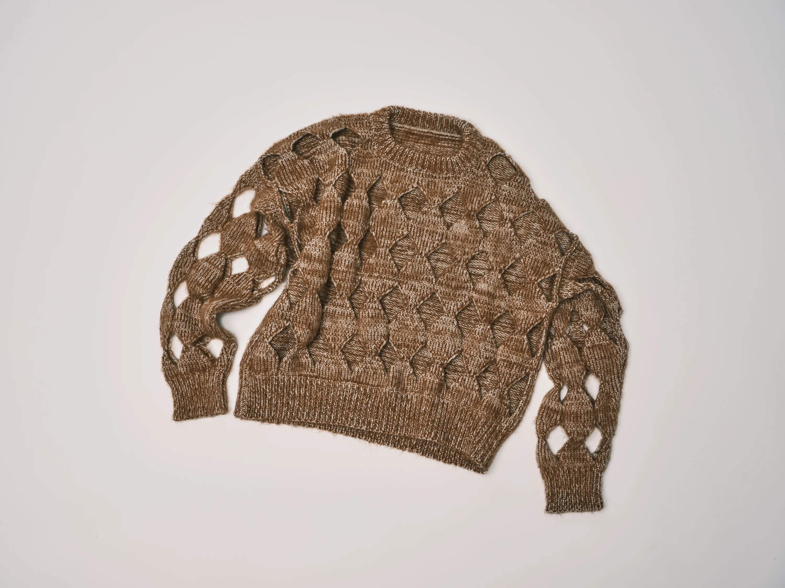 Harlequin diamonds reveal what you are wearing underneath to create a depth to the visual. Each diamond is shaped by increasing a decreasing the number of stitches by hand in individual groupings and is created with the profound beauty of high craft. The sweater base is 100% Andean Highland Wool knit with a thin fuzzy alpaca yarn that gives the color depth and dimension.